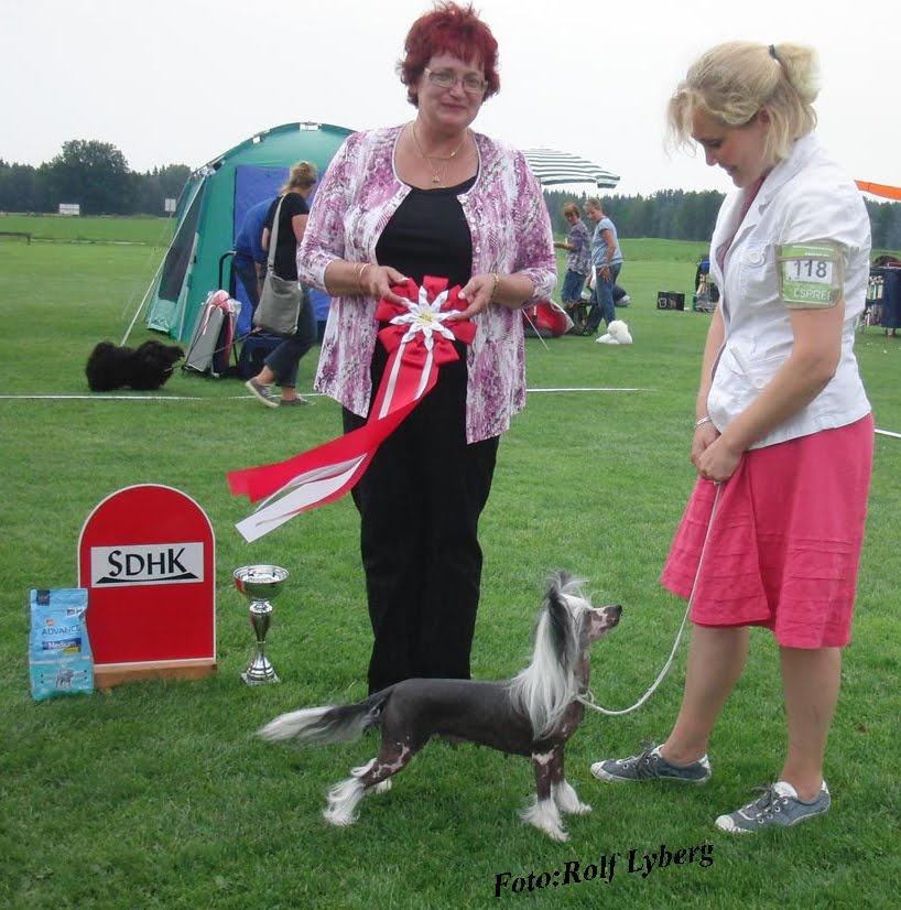NordJW-11 PREFIX FAIR PLAY ON BROADWAY went to England with Rebecca , she was entered at 4 shows and she won CC, Best Bitch and Res BIS at THE CHINESE CRESTED CLUB show 6/5 judge was Ray Morland. Jennifer Gorwill gave her  RCC at Birmingham 11/5 and Tom Mather RCC SKC 19/5. In Copenhagen 16-17/5 first day she was BOB with CAC and CACIB  judge Birte Scheel. Second day under judge Andreas Schemel won CAC, CACIB, BOS and the title Copenhagen Winner-12.