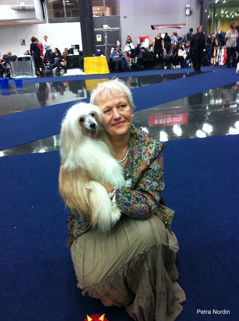 Then it was ”Mary´s” turn, 9 months old won the junior class and finished with a BB-5, one placing from the CAC. which went to PREFIX X-MAS GIFT (sister of BOB Crufts-10) who also became our 46th Crested Champion. Not only did she get her title Swedish CHAMPION but also BOB!!! PREFIX SWEDE SMELL OF SUCCESS was BB-4.